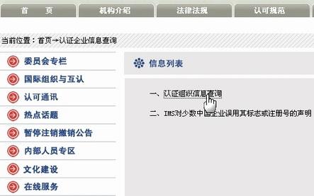 2、于中文首頁(yè)左下方,點(diǎn)擊“認(rèn)證組織信息查詢”,進(jìn)入信息列表;