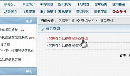 3、點(diǎn)擊“體系查詢”下“管理體系認(rèn)證證書公眾查詢”字樣,進(jìn)入正式查詢;